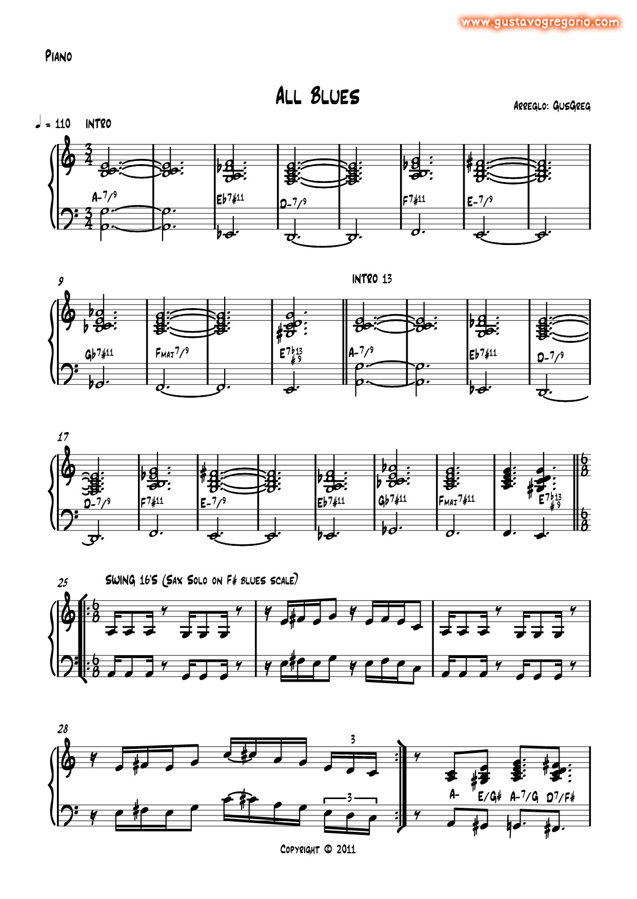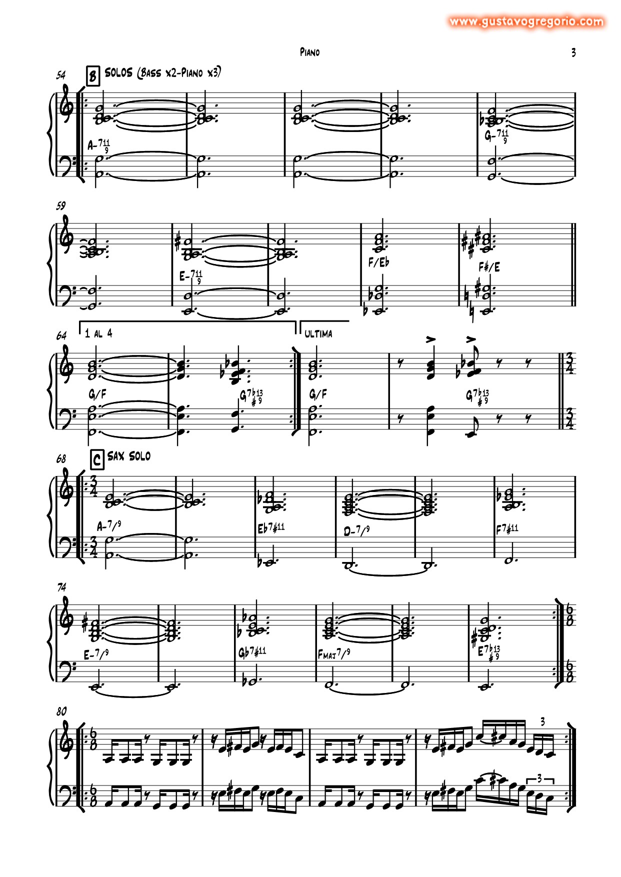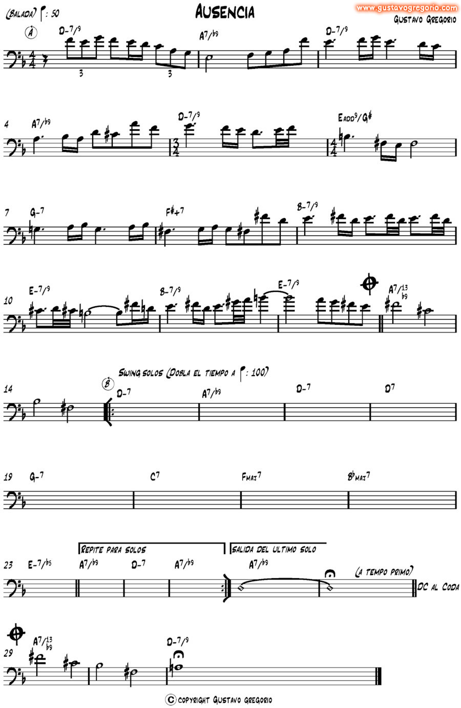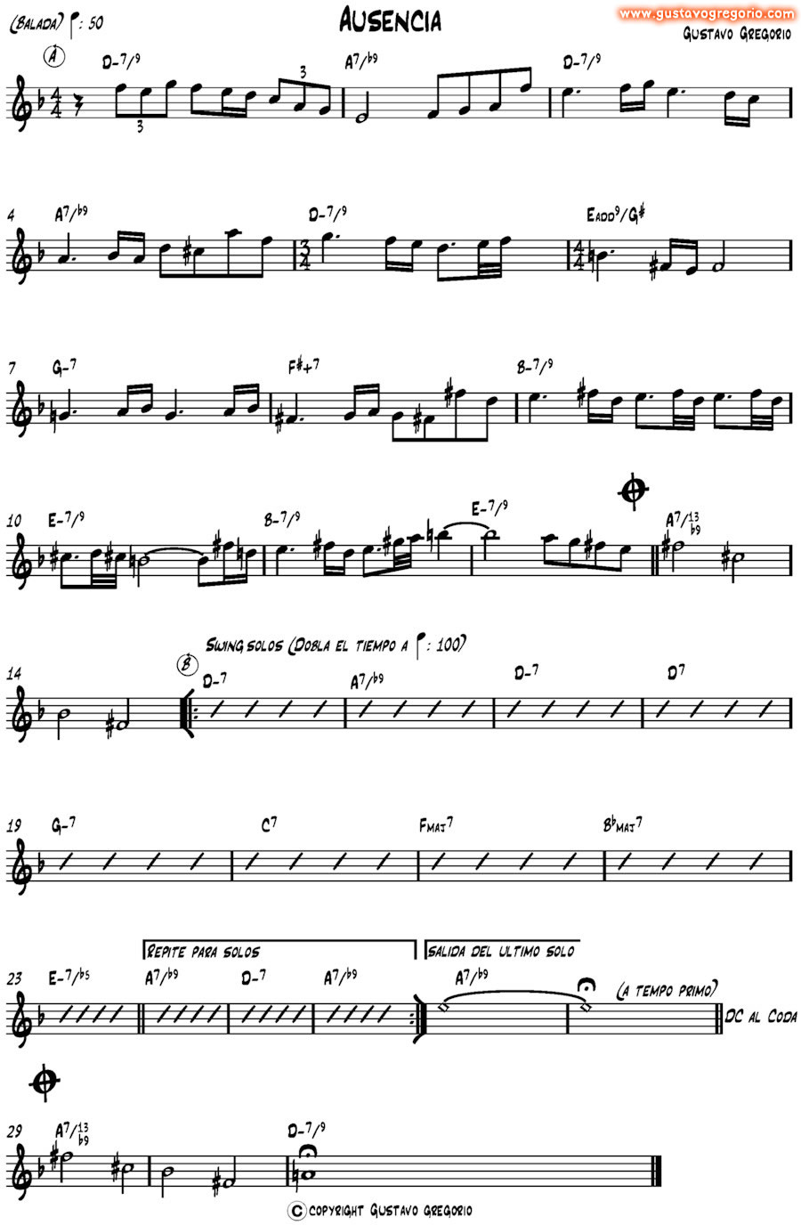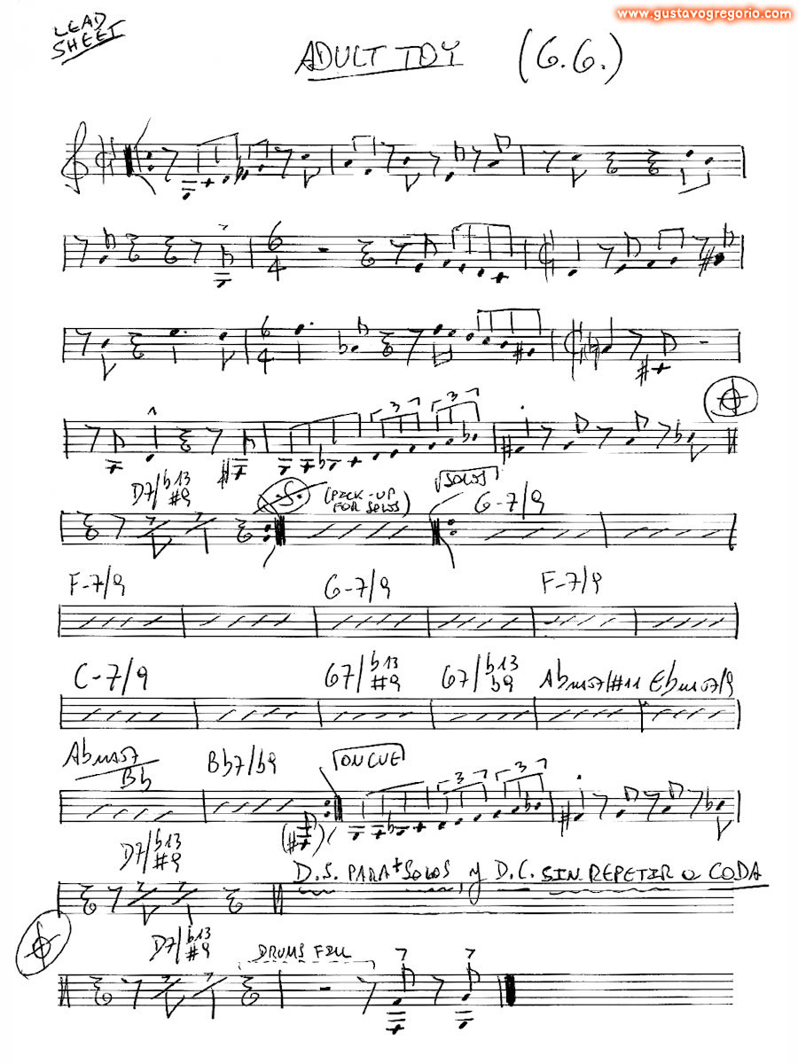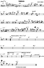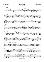 Es un blues en tonalidad menor pero sólo en la sección de solos; la sección de la melodía es una balada a la mitad del tiempo de los solos, y no es swingueada, las corcheas se deben leer como corcheas normales, no atresilladas. Fíjense en el compás sorpresivo de 3/4 y en el próximo compás, el acorde que lo integra está cifrado como Eadd9 con bajo en G#, pero también podria entenderse como un G#-7/#5. Lo compuse en 1987 en Buenos Aires, y lo tocaba habitualmente con mi banda Ditirambo. |