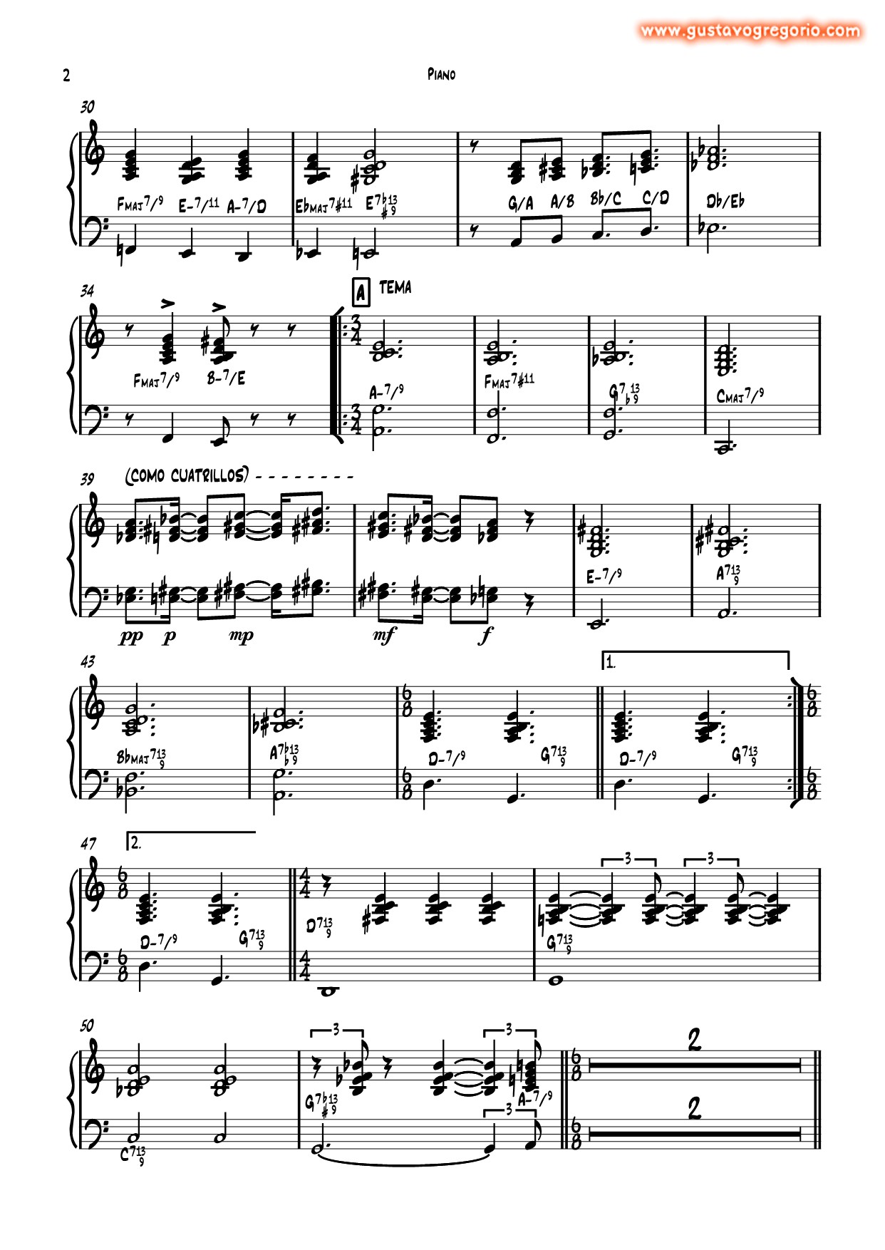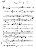El groove es difícil de catalogar en un sólo estilo, la palabra "fusion" es la más adecuada ya que engloba varios entre sí. El arreglo, al igual que los otros 11 temas del disco, se basa en una rearmonización profunda de cada standard elegido. Comencé a escribirlo sobre un groove en 3/4 con bajo y batería haciendo un guiño a la frase en 6/8 característica del bajo en los compases 45 y 46 o 45 y 47, por ej. cambiando abruptamente a un 4/4 del 48 al 51 para continuar a los solos en el 6/8 original. |
