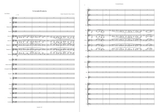 Lo elegí como ejemplo ya que es un arreglo orquestal pero con tratamiento tipo Big Band, más vertical que horizontal y además incluye base rítmica. Lo incluyo aquí completo para que puedan apreciar el tratamiento de las diferentes secciones, en compases 1 a 9 sección Metales, del 16 a 28 la misma sección pero con el tutti orquestal, de 29 a 50 sólo las cuerdas, de 51 a 72 incluye maderas, del 73 a 97 un acompañamiento tipo tutti para el solo de guitarra. |